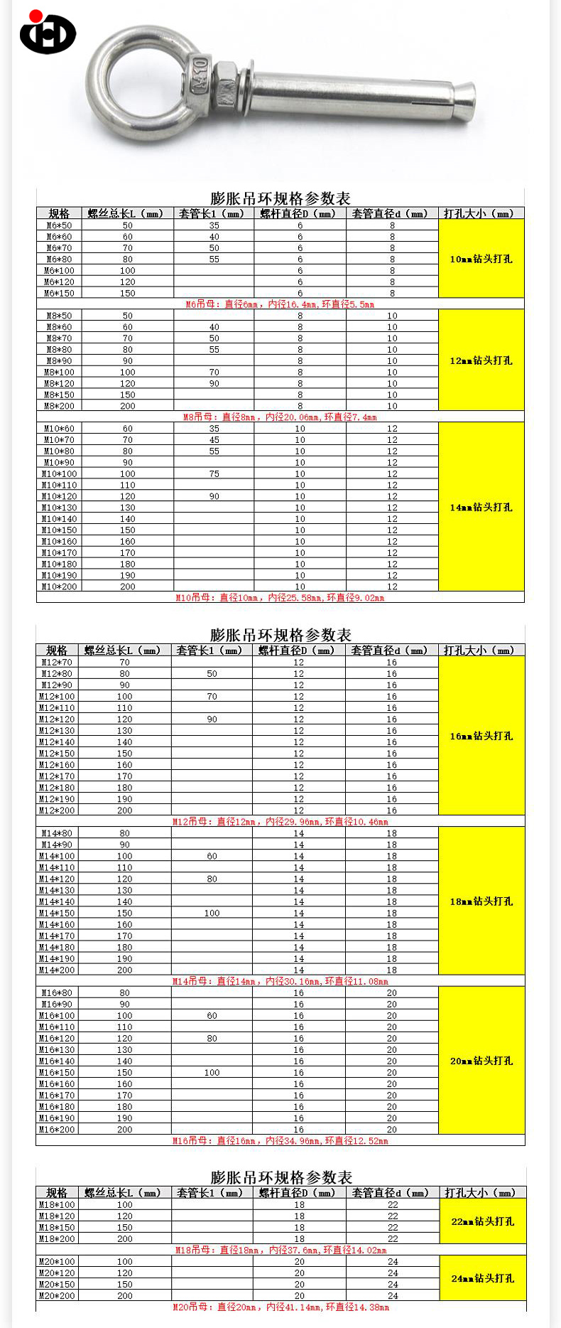 Neo bu lông mắt nặng được làm bằng vật liệu thép không gỉ dày 304, với độ bền kéo hơn 400MPa, và có thể chịu được lực kéo dài từ hàng trăm kg đến vài tấn. Cho dù đó là lắp ghế sofa, dây phơi quần áo, thiết bị chiếu sáng nặng hoặc lắp đặt thiết bị công nghiệp và lan can bảo vệ, nó có thể cung cấp hỗ trợ cố định đáng tin cậy.